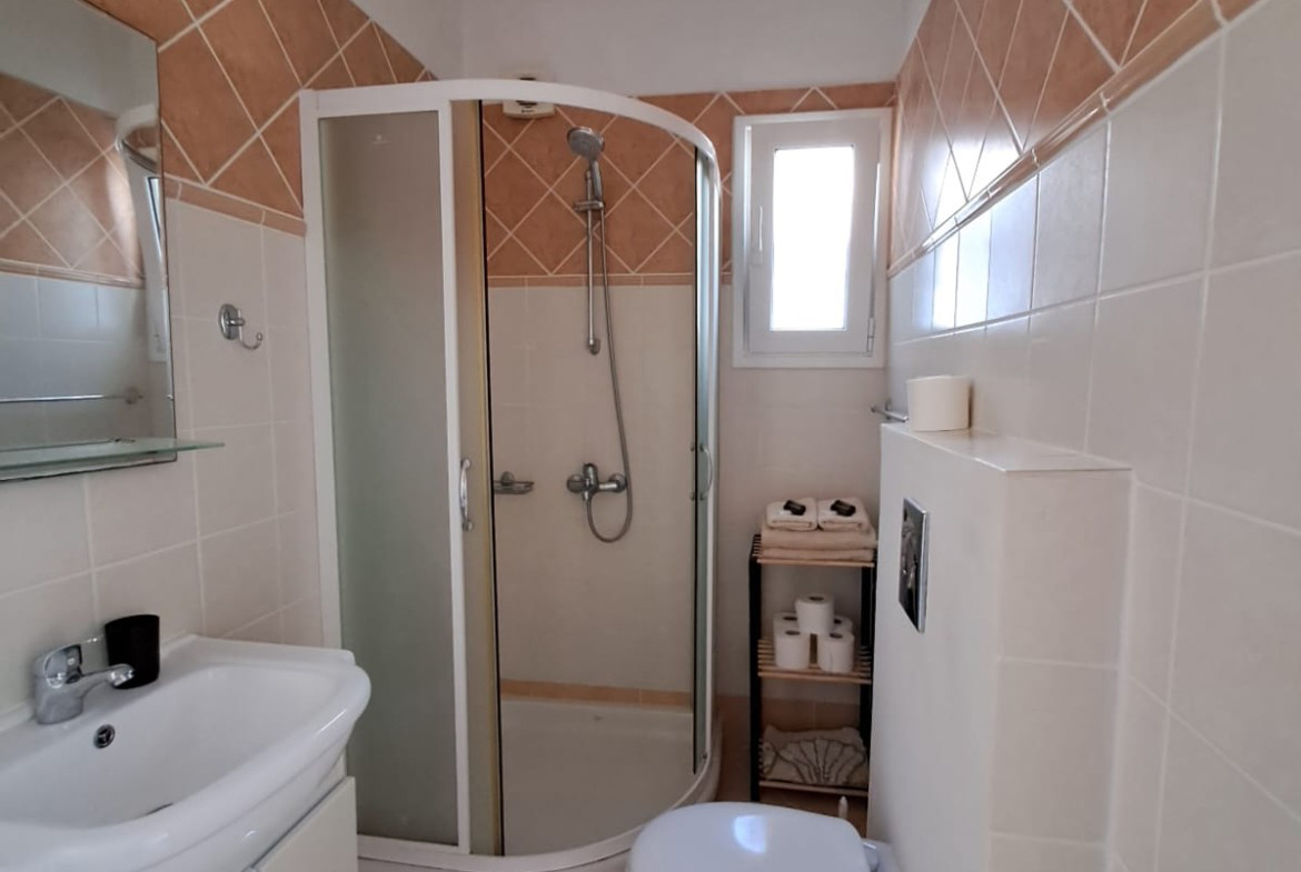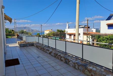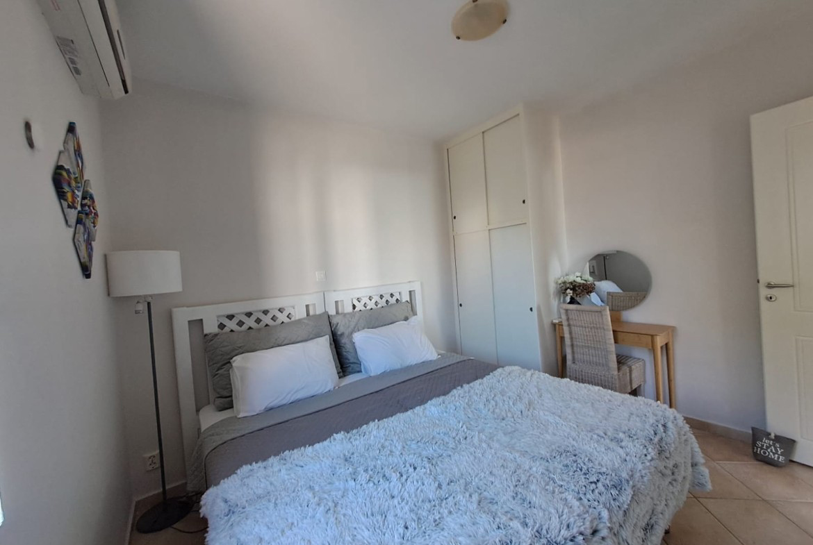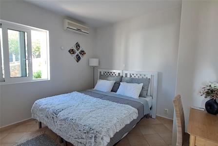 • One set of steps leads from the parking to the private tiled patio, partly covered for outdoor dining and to the side of the apartment there is a bed for plants. There is sea and village view from the garden and partial sea view from the pool area.