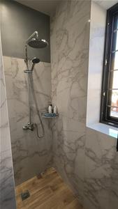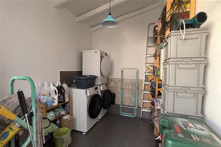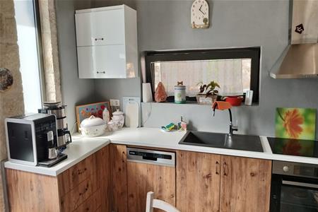 The entrance opens to a bright, open-plan living area with a high wooden ceiling and large windows that fill the space with sunlight. The area includes a well-equipped kitchen with plenty of storage, a dining space and a cozy living room featuring a wood-burning stove. A short hallway leads to the bedrooms, which include a master bedroom with an en-suite bathroom, two further bedrooms with built-in wardrobes and a separate full bathroom. A utility room offers the potential to be converted into an additional bedroom or guest accommodation.