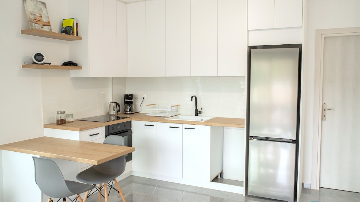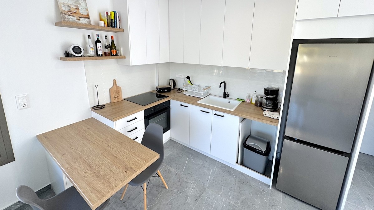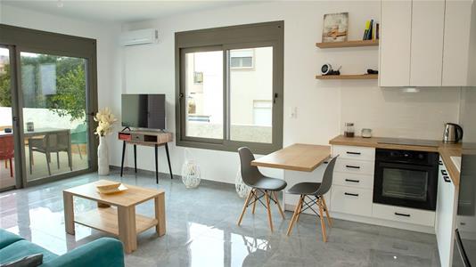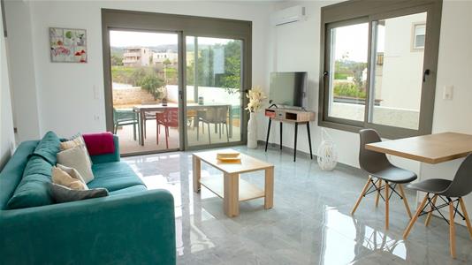 Elke woning heeft een open woonkamer met ingerichte keuken en eetkamer, met toegang tot een ruime overdekte veranda en eethoek buiten, met uitzicht op het zwembad.