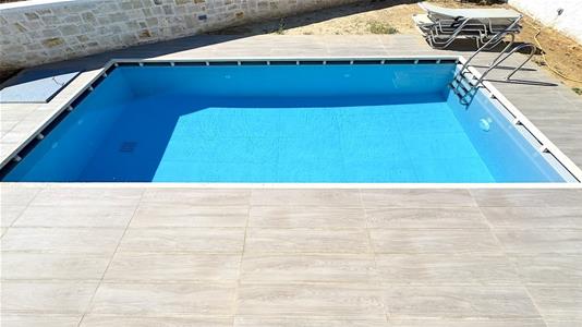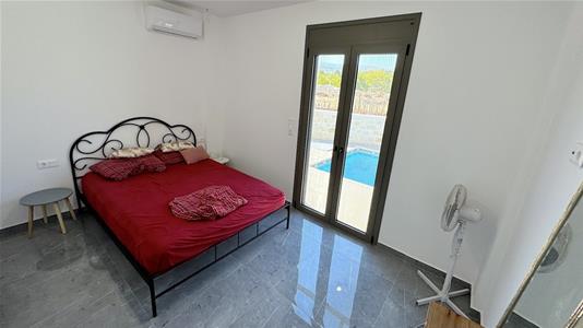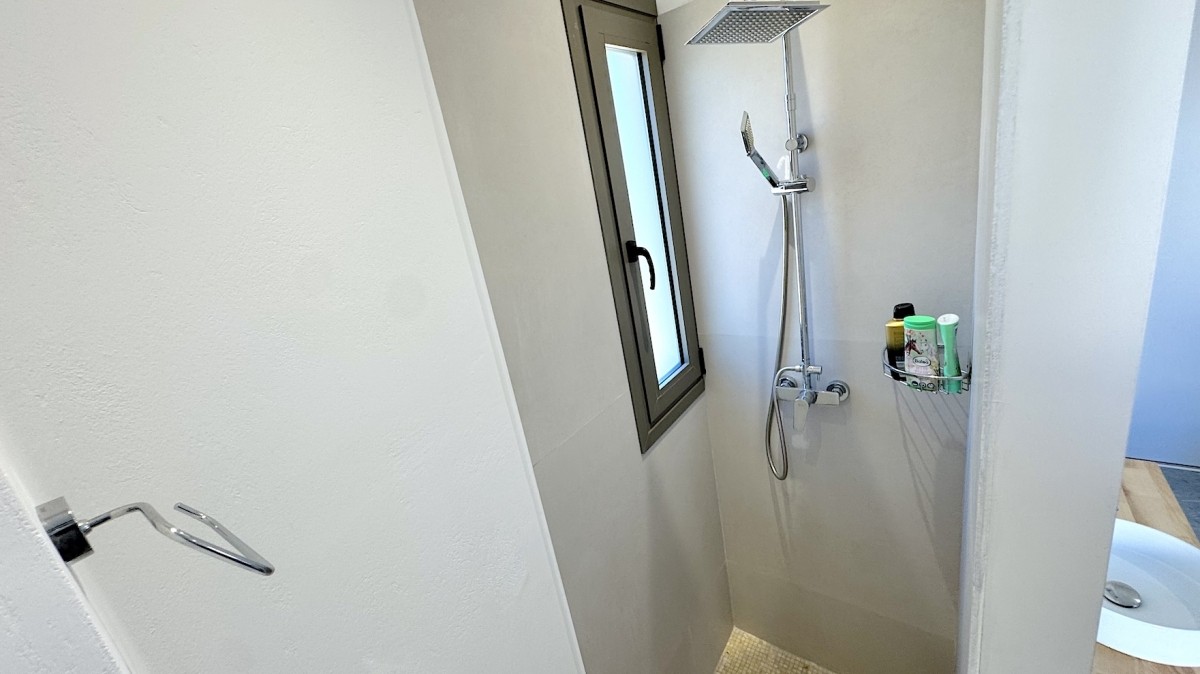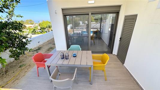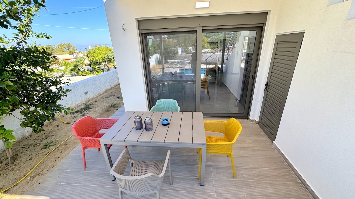 Buiten bevindt zich een privézwembad van 26,5m², omgeven door een patio, een eethoek en de tuin. Er is ook een groot betegeld dakterras met uitzicht op zee.
