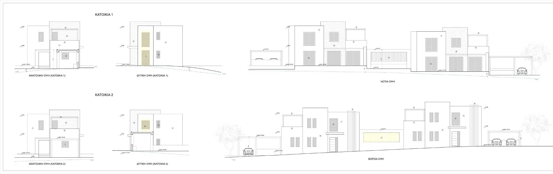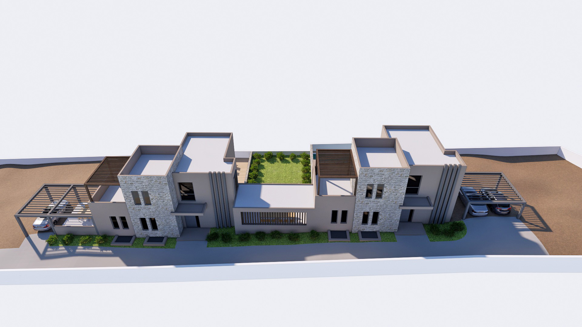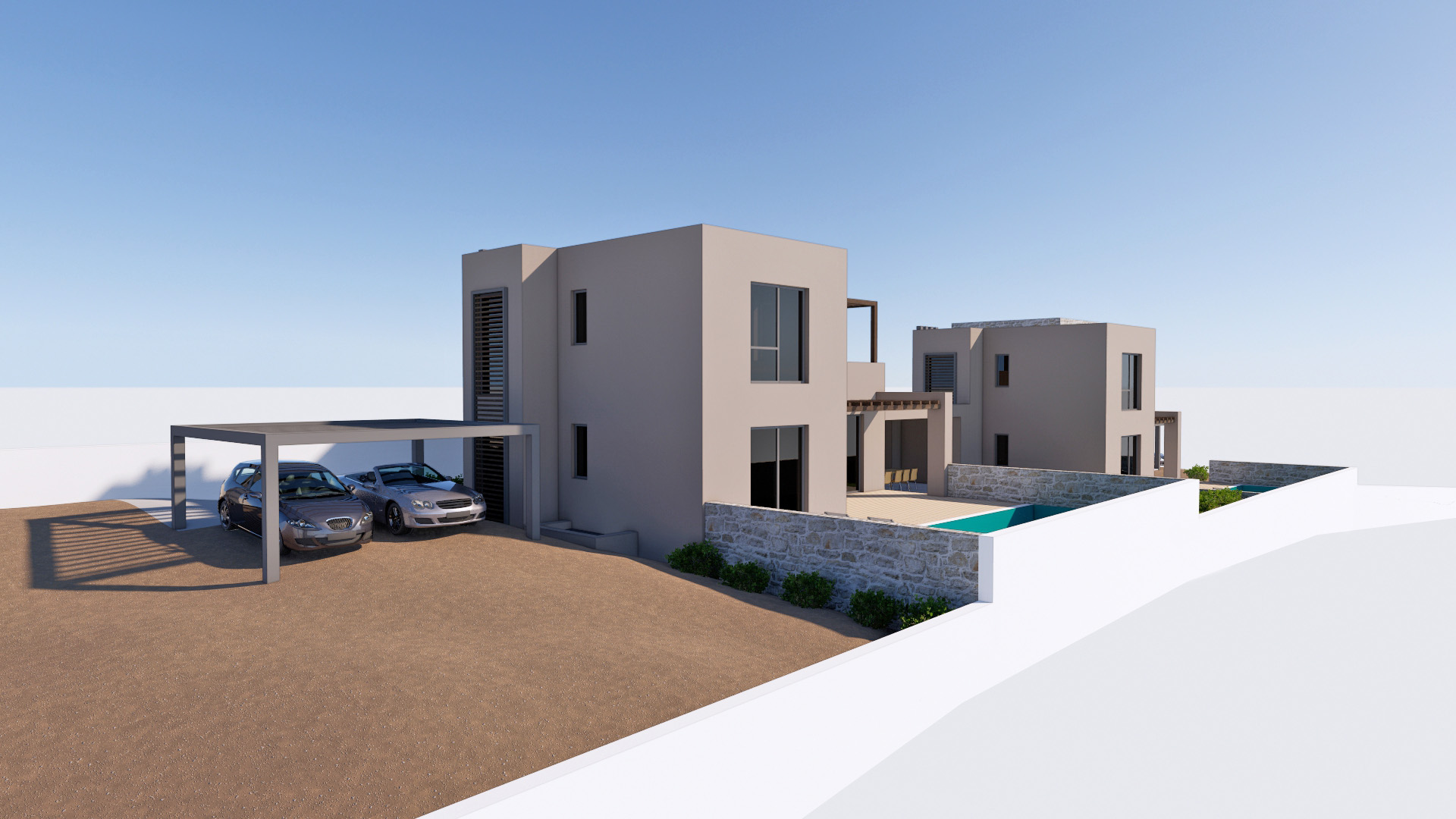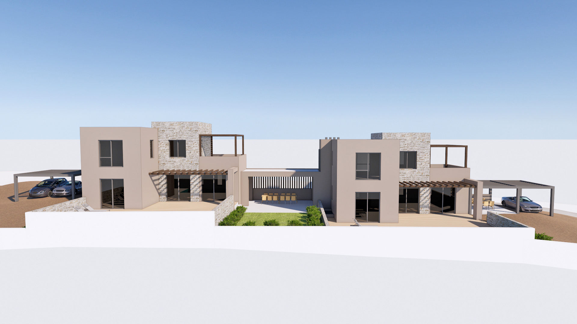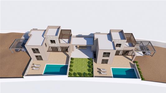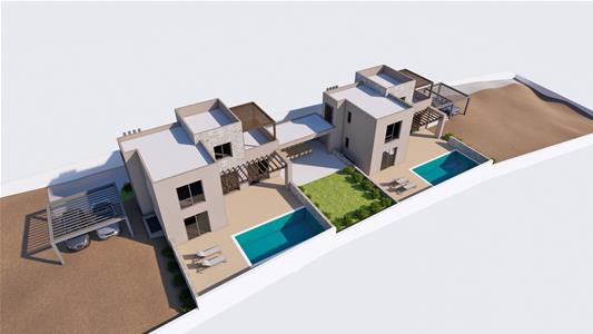 De villa's zijn ontworpen op twee niveaus en verbonden door een overdekte ruimte. De begane grond bestaat uit een ruime open keuken/woonkamer, een badkamer met een douche van muur tot muur en een tweepersoonsslaapkamer met openslaande terrasdeuren naar de zonneterrassen rondom het zwembad. Een interne trap leidt naar de benedenverdieping, die de kelder wordt, en naar de bovenverdiepingen, die bestaan uit een gang, een gedeelde badkamer met douche van muur tot muur en twee tweepersoonsslaapkamers, waarvan één met openslaande deuren naar een ruim balkon! 384m² van het perceel zal worden gebruikt als gemeenschappelijke toegang voor de villa's en elke villa heeft het exclusieve gebruik van 700m² grond.