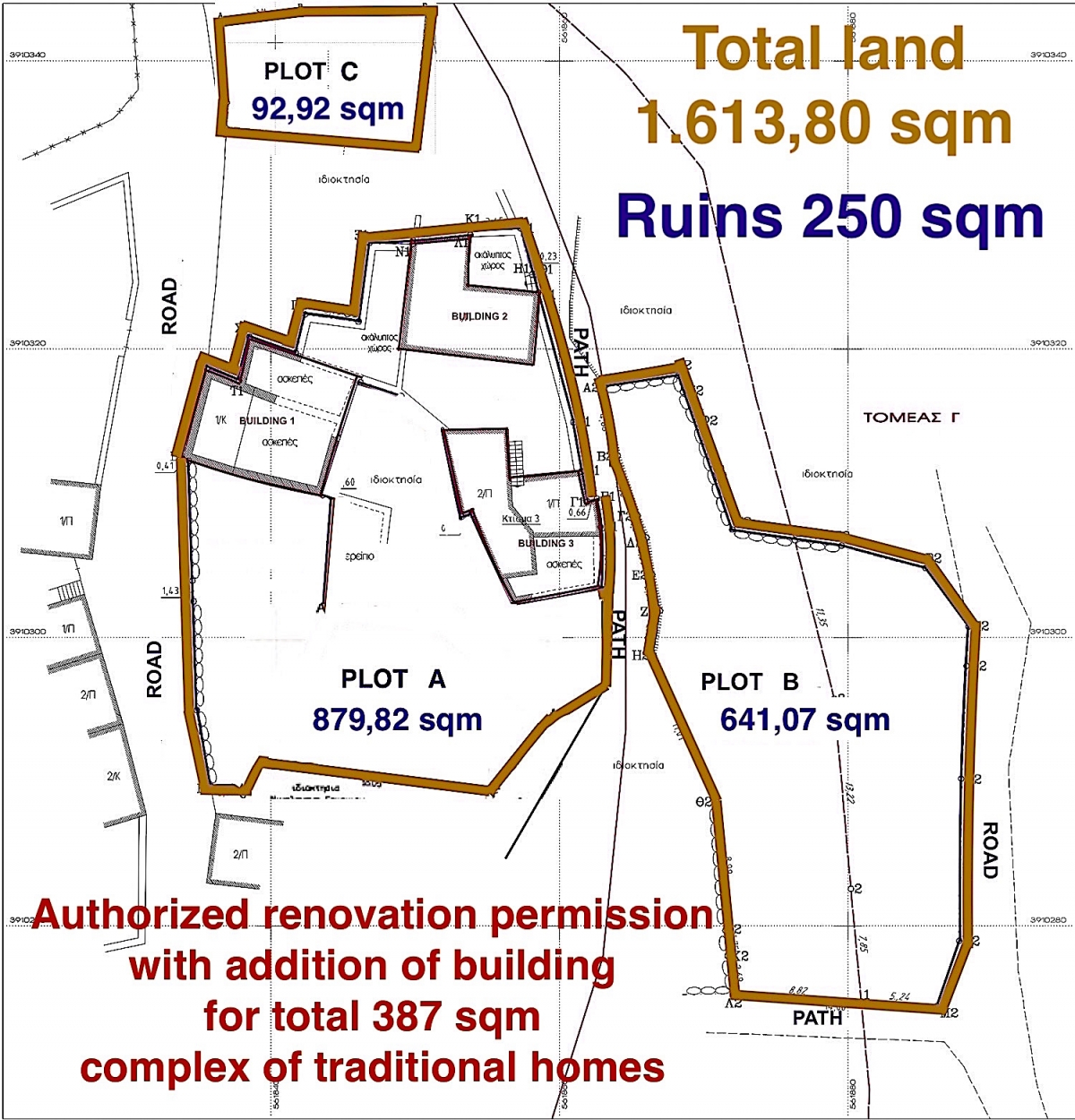 The property comprises a land parcel of 1,613.80sq.m and features a complex of three interconnected stone structures with a total built area of 250sq.m.