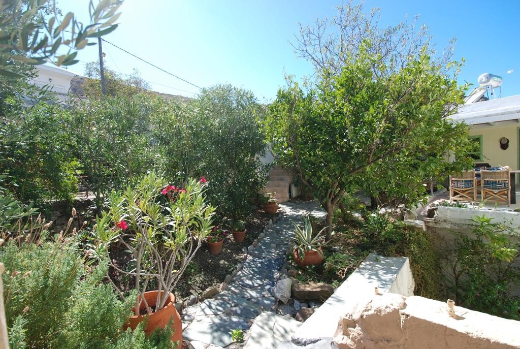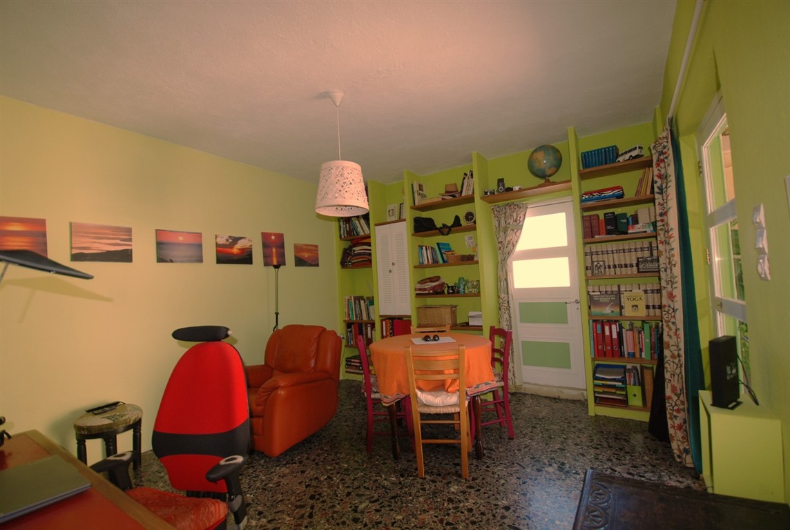 The outdoor areas are a standout feature of this property. The central terrace, shaded in parts by a bamboo pergola, is perfect for outdoor dining and relaxing. The surrounding gardens are lush and beautifully cared for, featuring orange, lemon, and almond trees, mature shrubs, and flowering plants. At the upper terrace a charming stone-built outdoor bathtub, set against a warm-toned wall, offers a unique place to unwind.