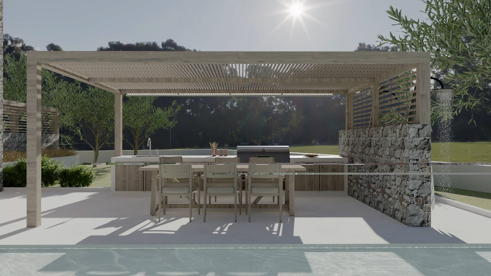 De villa "verdeelt" het terrein in een voor- en een achtergedeelte. Aan de achterkant van de woning bevinden zich de parkeerplaats, de entree en een stukje tuin, terwijl aan de voorkant het privézwembad van 40m² ligt, omgeven door zonneterrassen, een prachtige overdekte BBQ , een terras en aangelegde tuinen langs het zwembad.