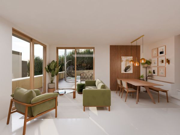 Each villa of 90m² has been carefully designed offering a luxurious stay, featuring a fully equipped kitchen, dining area, living area, two cozy double bedrooms, two bathrooms, AC units in every room for comfort throughout the year, large balcony and swimming pool area.