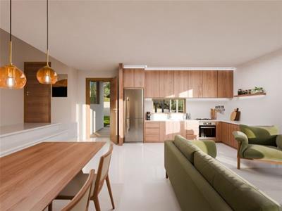 The property comprises of an open plan kitchen, dining area and living area seamlessly connected through a large patio door to an outdoor pergola-seating area and the swimming pool.