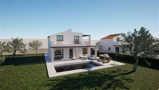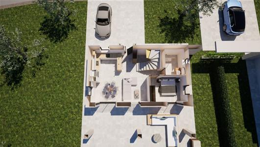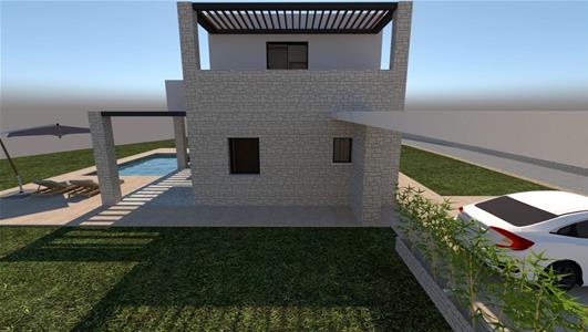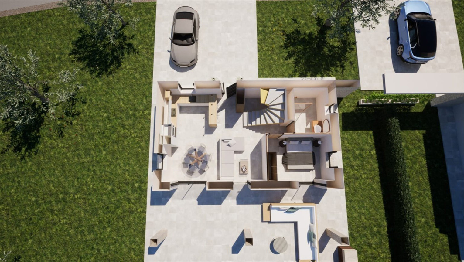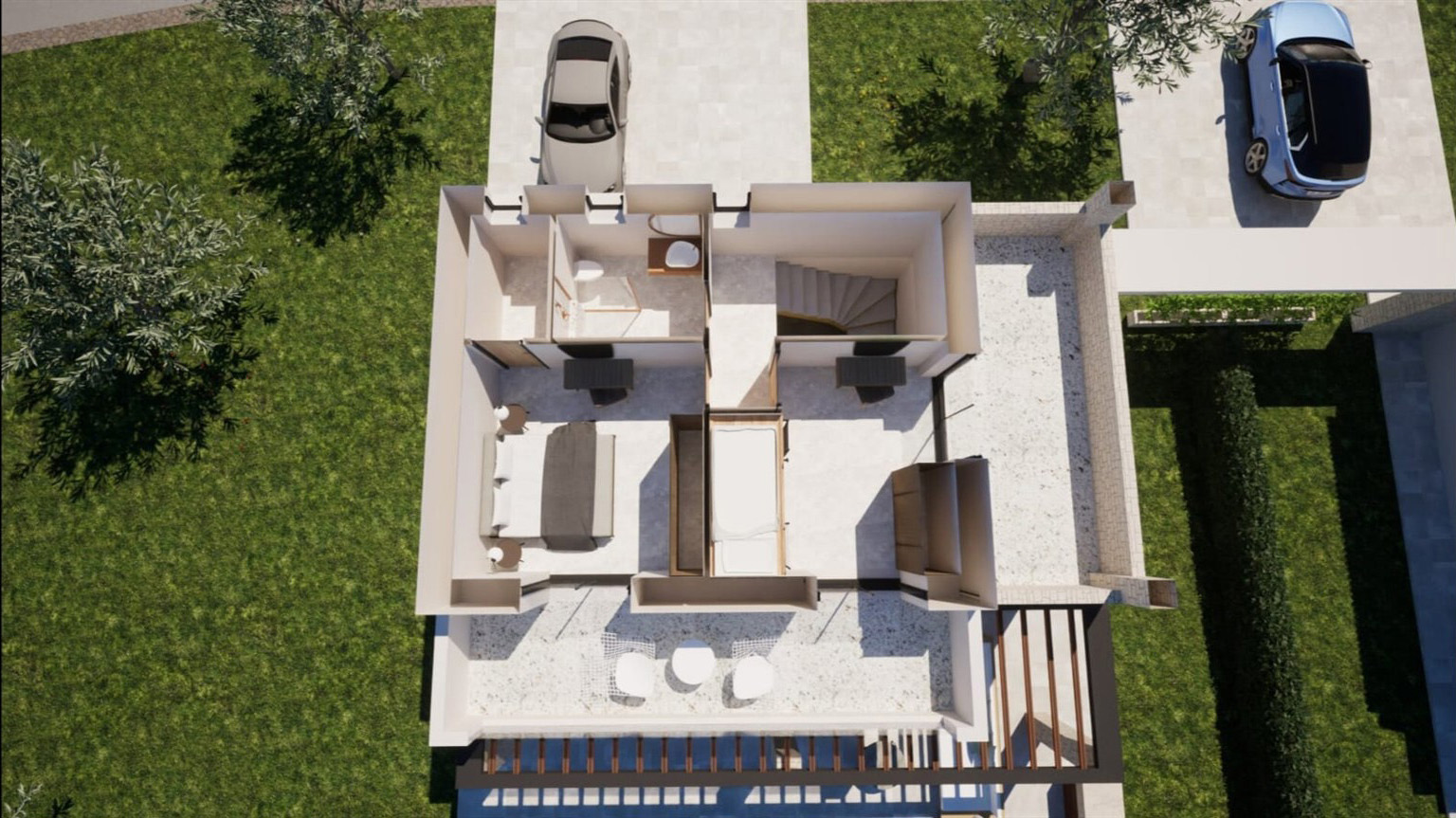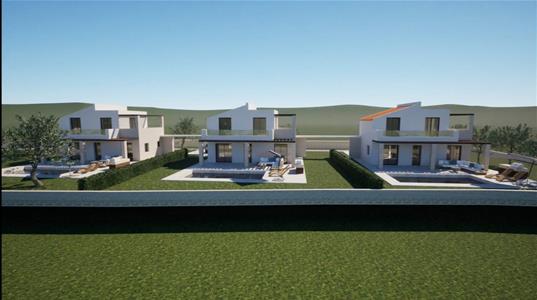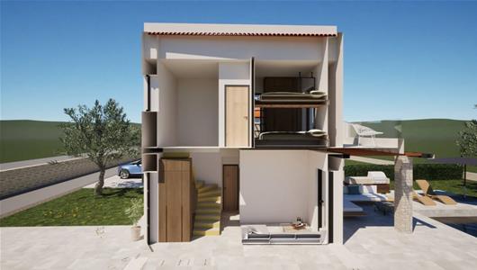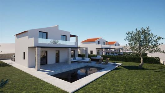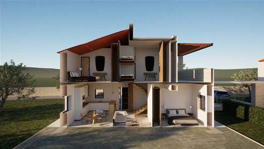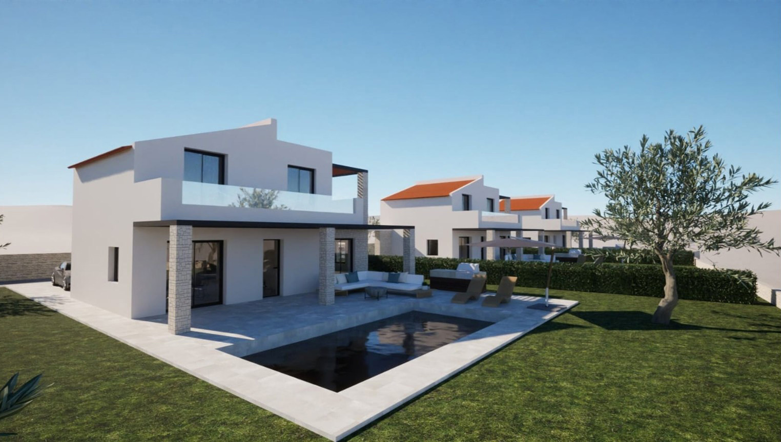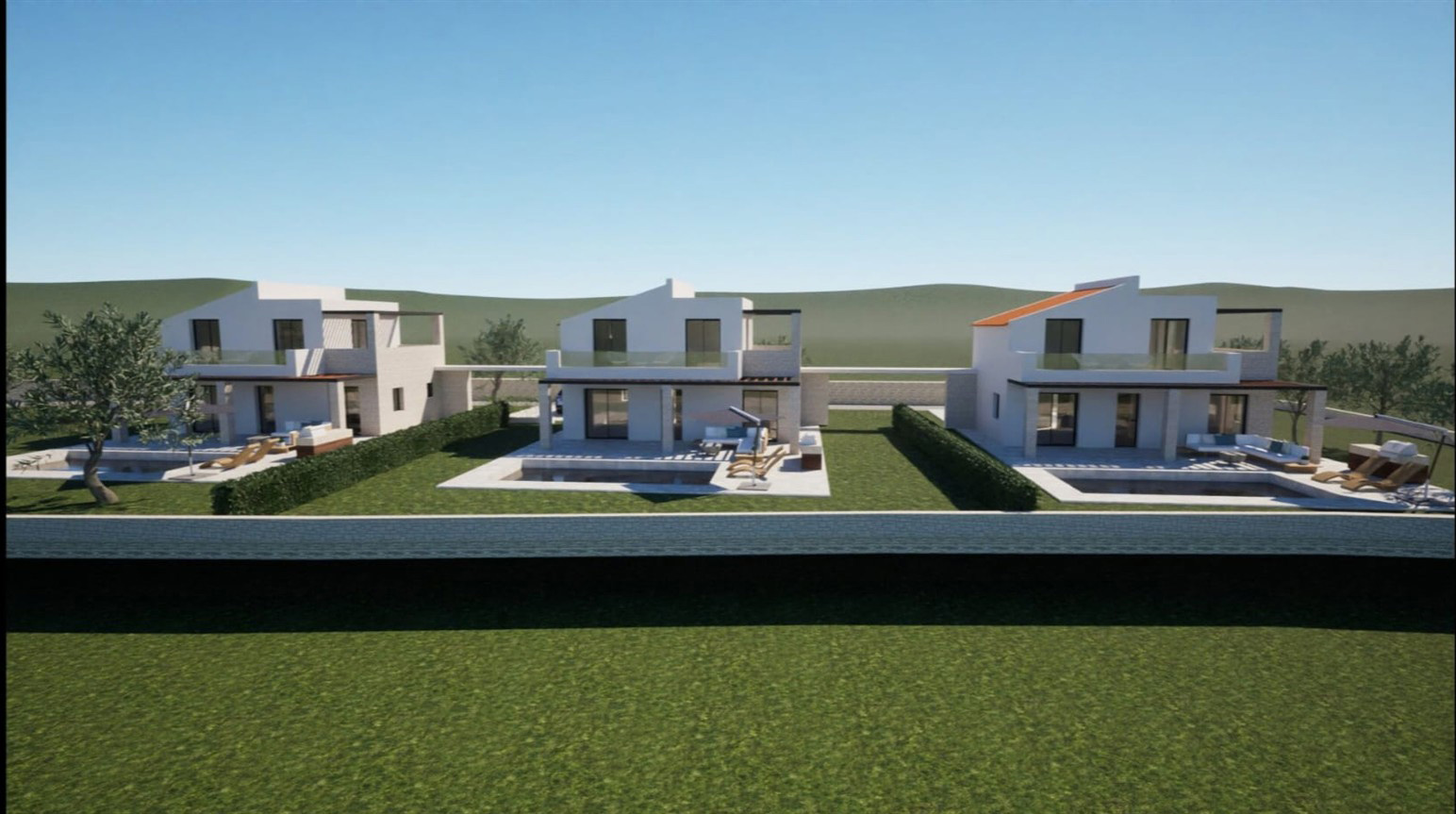 It is part of a three-villa complex nestled in an olive grove, offering 84sqm of living space on a private 700sqm plot in a peaceful and serene setting.