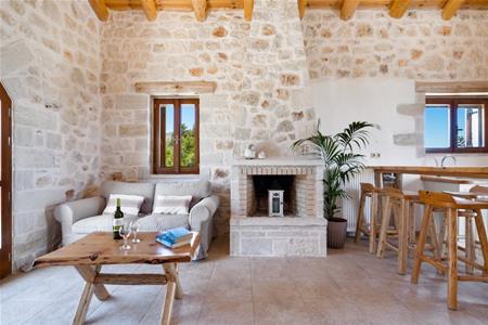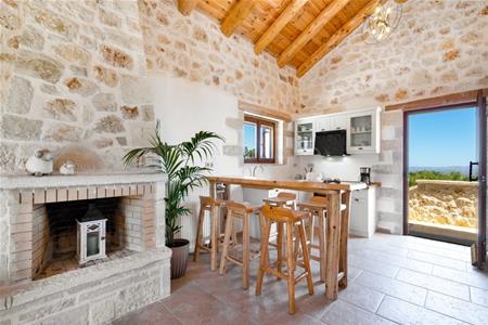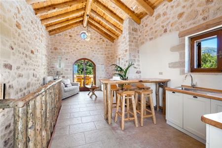De open woonkamer is slim ontworpen voor maximaal comfort en optimaal ruimtegebruik, met aan de ene kant de ingerichte keuken en eetkamer, aan de andere kant de lounge. Dubbele openslaande deuren leiden naar het balkon met uitzicht op zee en de bergen. Een buitentrap leidt naar het zwembad en de tuin met een kleine koivijver. Het rustgevende geluid van de rots-watervallen, af en toe afgewisseld met het geluid van geitenbellen, terwijl ze over de heuvels dwalen, klinkt als muziek in de oren.