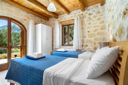 Slaapkamer 2: heeft twee eenpersoonsbedden en een privé badkamer en toegang tot de tuin.